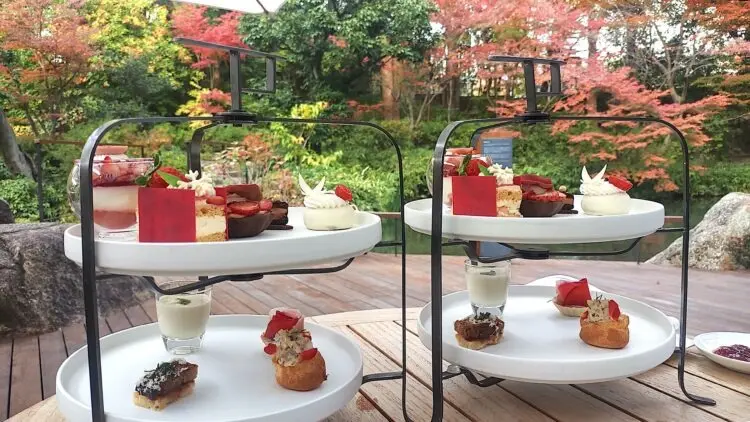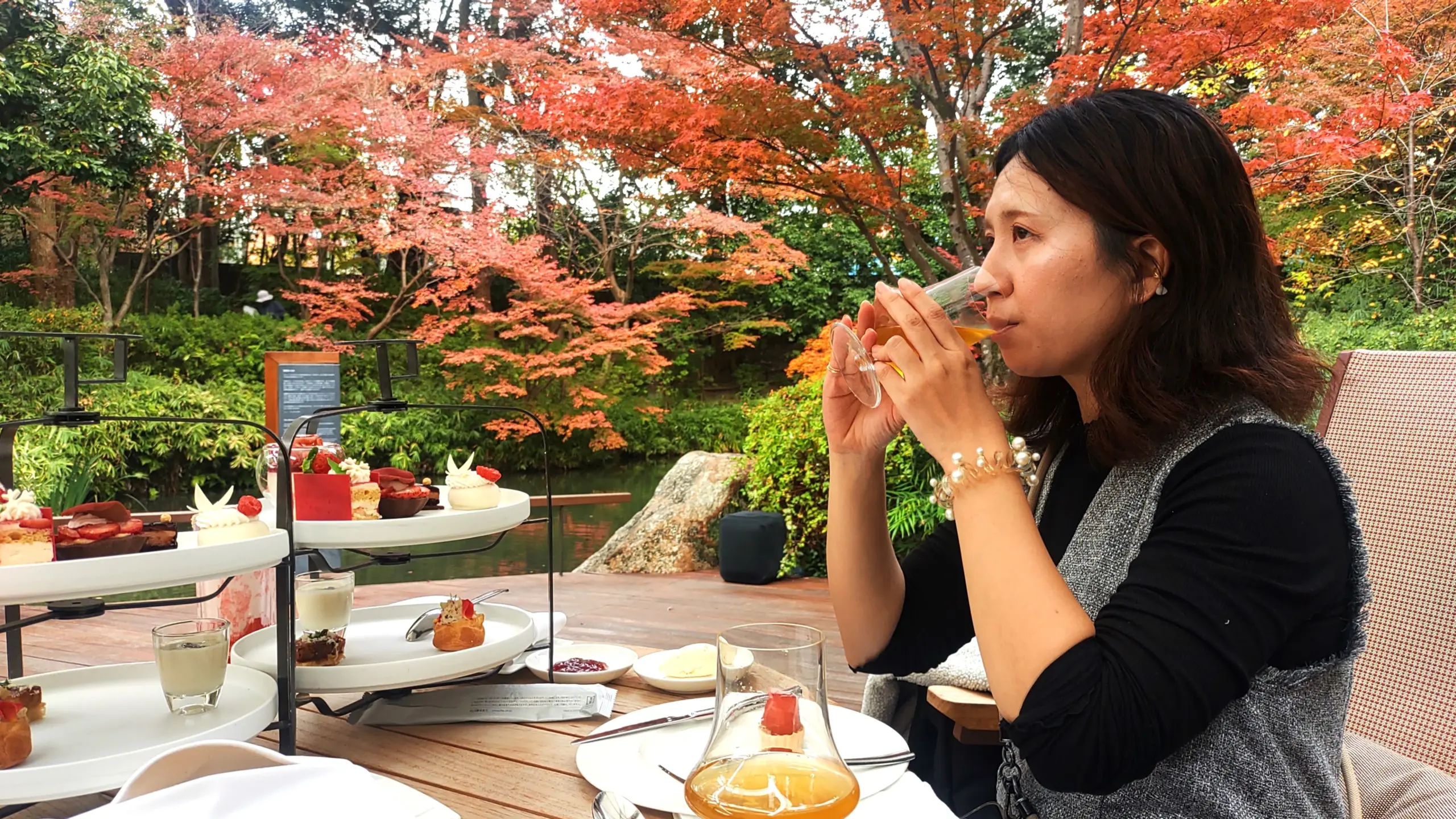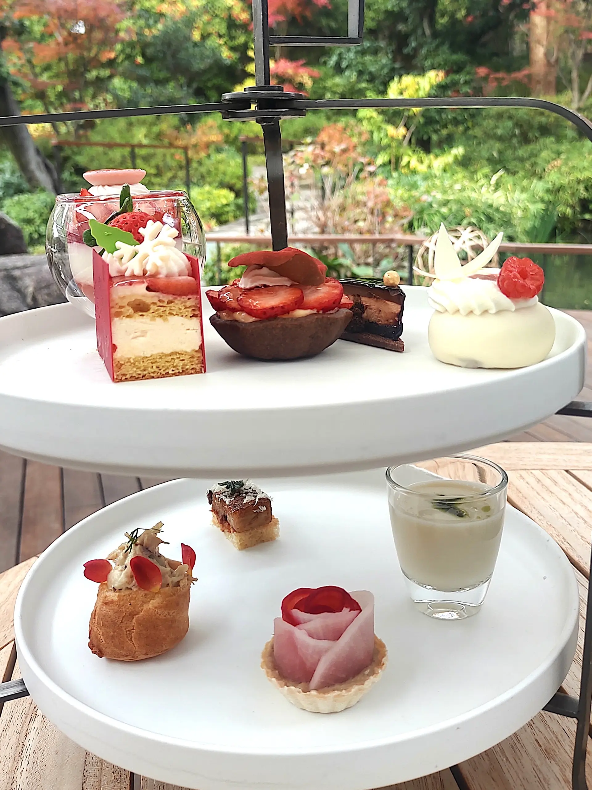今回は、積翠園を臨むテラス席でアフタヌーンティーを楽しんだ。12月でも少し暖かい日だったので、紅葉が始まった木々や自然に囲まれた水面を眺めならがのアフタヌーンティーは最高。