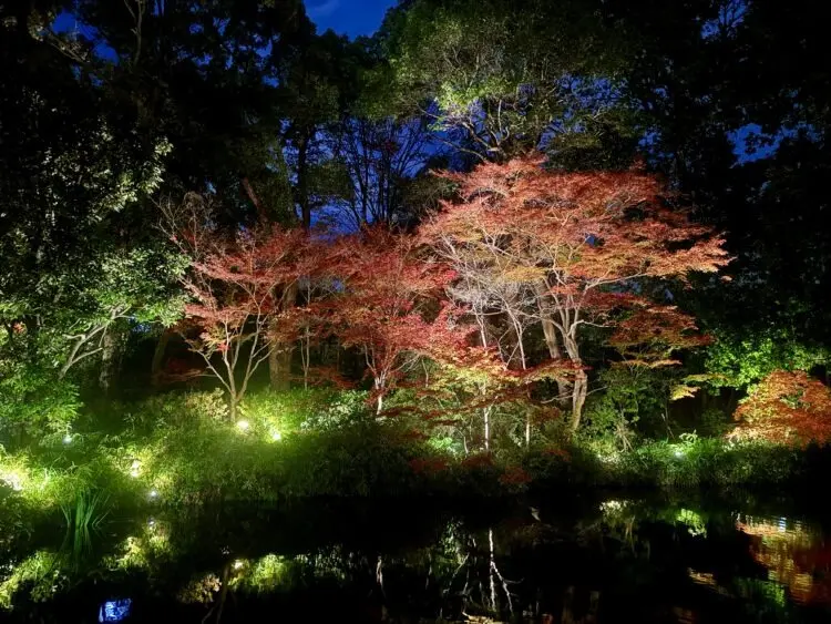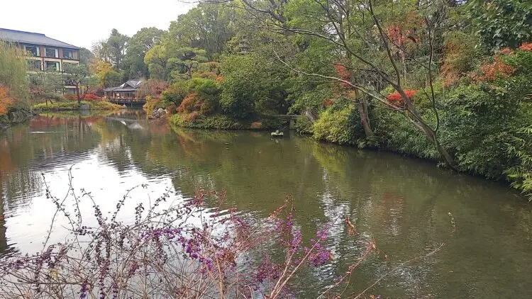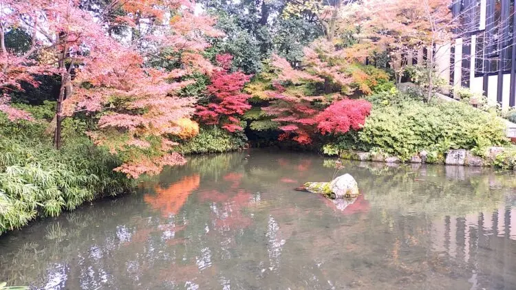 京阪七条駅から徒歩10分ちょっと緩やかな坂道を登って行き、道路沿いから竹で囲まれた通路へ折れるとその先にホテルの建物があり、建物の裏側には約800年の歴史を刻む名庭「積翠園(しゃくすいえん)」が広がっている。