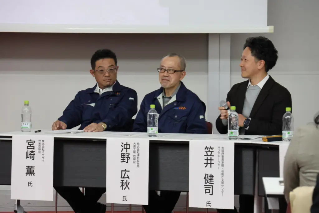製造業同士の事例として、八尾市の溶接業・株式会社ミヤザキが板金加工の沖野製作所(大東市)を買い受けた経緯を紹介。宮崎社長は「数字以上に〝この人と一緒にやれるか〟を重視した」と述べ、売り手の沖野氏も「不安はあったが、仕事を通じて信頼が深まり、思いを丁寧に受け止めてもらえた」と振り返った。成約後は工程の内製化が進み、短納期対応や受注拡大などにより成長が加速しているという。