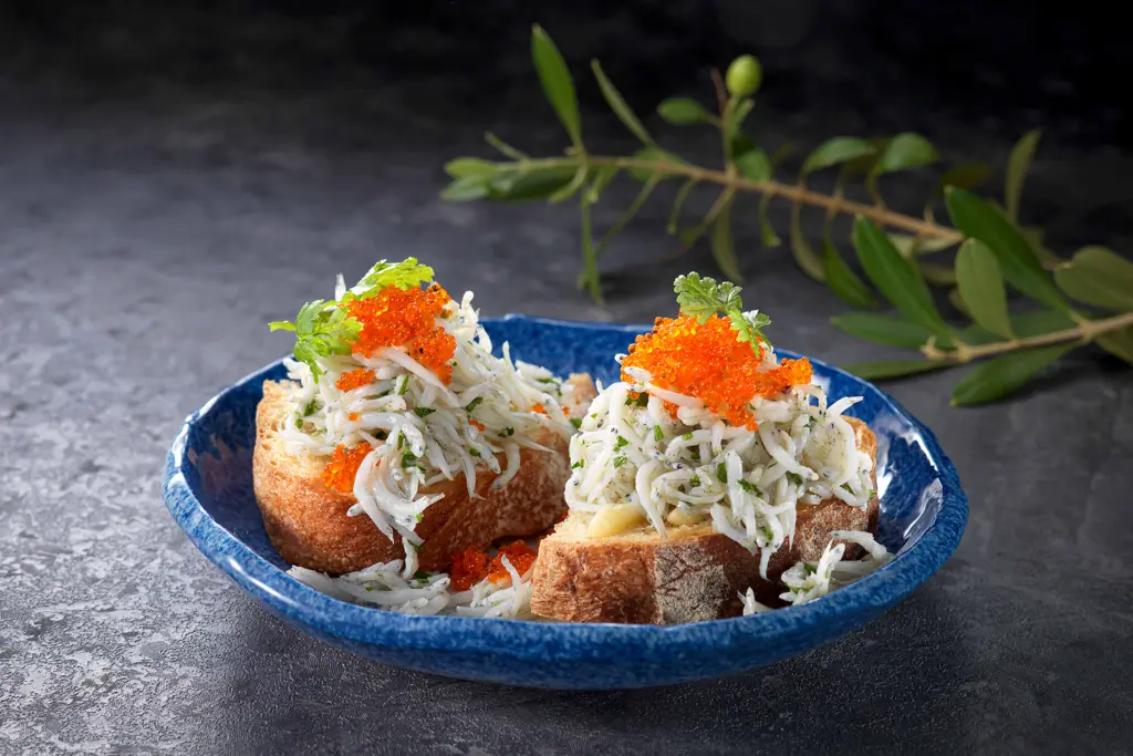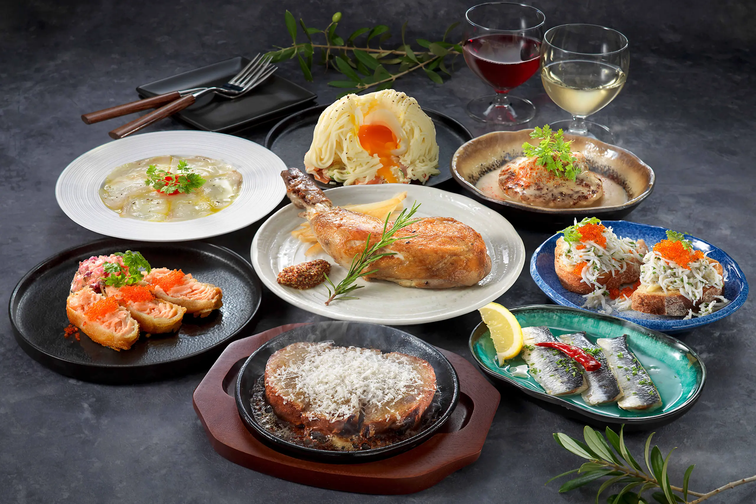 このほか、岸和田漁港で水揚げされた釜揚げしらすを豪快に盛り付けたブルスケッタや、大山どりの骨付きもも肉を低温調理したコンフィ、鳥取県産グランサーモンをレアに仕上げ、提供時にスモーク演出を施すカツなど、酒場メニューも充実させた。