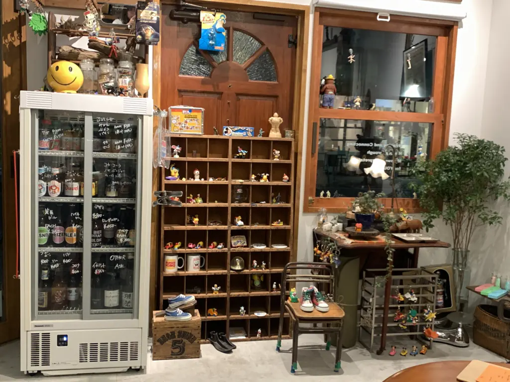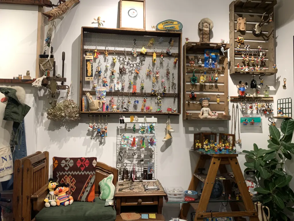 20年以上かけて収集したアメリカントイやヴィンテージグラス、陶器製のフェーヴ、古着などの古道具を取りそろえる。国や年代が異なる品々を、物語を感じさせる構成でディスプレーするのが特徴。