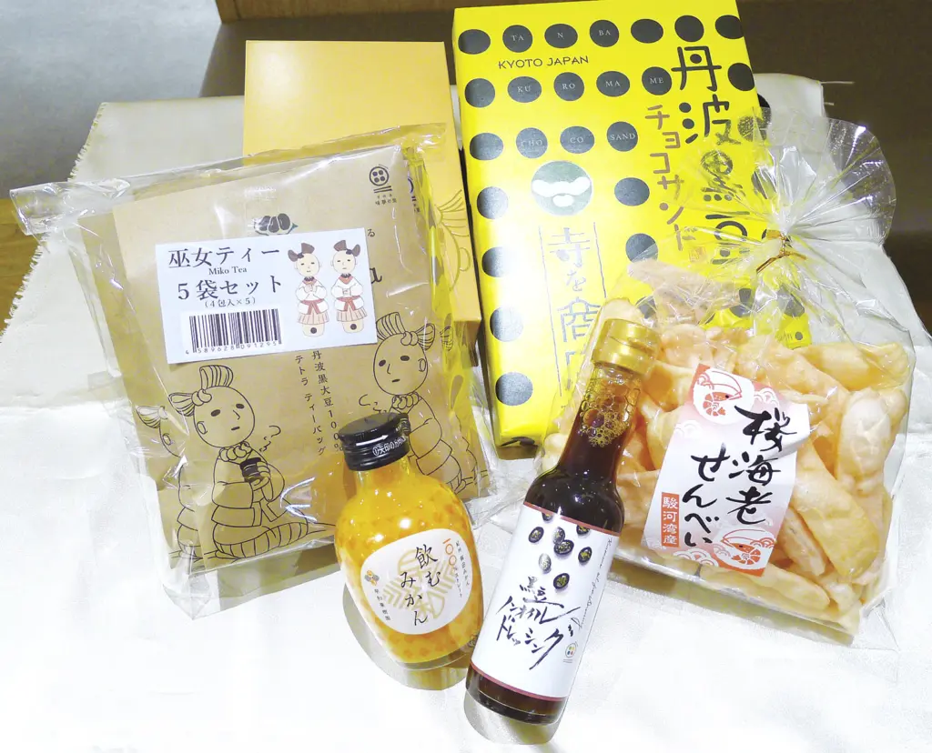 京都縦貫道で人気の道の駅「味夢の里」では、京都丹波産の香ばしい黒豆を使ったドレッシングをはじめ、京都丹波黒豆せんべい、巫女フィナンシェ、丹波黒豆100%のテトラティーバッグ「巫女ティー」(4包入り×5袋)、駿河湾産桜海老せんべい、紀州有田みかん100%の「飲むみかん」など、道の駅で好評の商品の詰め合わせ。計4,320円相当がが3,240円。京丹波を中心に、人気の“おいしいもの”を一度に楽しめる。