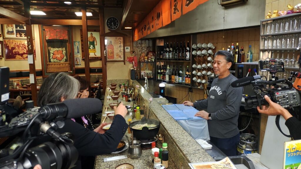 撮影後には、「食べきれなかったちゃんこ鍋をスタッフの皆さんで分けてください」というモモコさんの気配りにより、寒空の下で撮影を続けていたスタッフにも、熱々でだしの効いたちゃんこ鍋が振る舞われた。大阪のおかんを代表する存在として知られるモモコさんの、スタッフにまで心を配る優しい一面が垣間見えた場面だった。筆者も少し口にしたが、確かに評判通りの味わいだった。「おいしさでは誰にも負けない」と語っていたご主人の言葉も、決して大げさではなさそうだ。