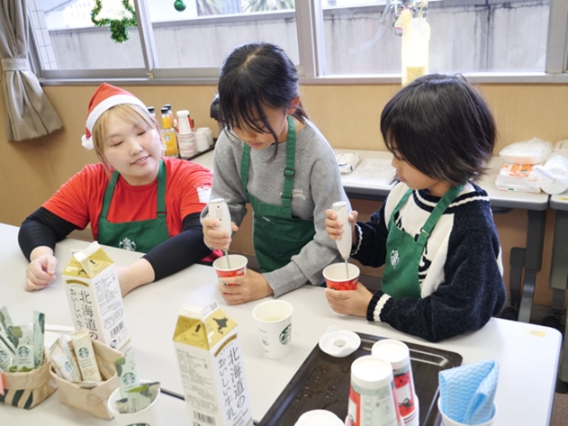 スターバックスは12月25日、豊中市の社会福祉法人大阪府社会福祉事業団が運営する「原田元町子どもランチ」で、「Be a Santa ドネーションプログラム」を実施した。会場には、サンタクロースの装いをした近隣店舗のパートナー(従業員)が訪問。子どもたちと一緒に、スターバックスのドリンクをつくるバリスタ体験や、コーヒーかすの抽出液を使ったクリスマスカード作りなどのワークショップを行った。最後には、一人ひとりにホリデーギフトが手渡され、会場は終始、あたたかな雰囲気に包まれた。