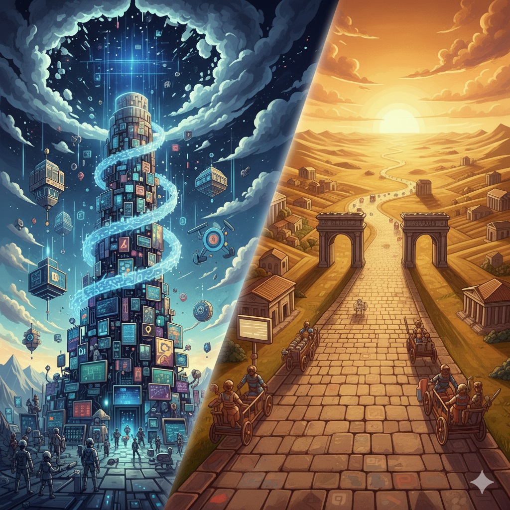 興味深いのは、そのグーグルが縦方向の性能競争ではなく、横への商用展開を強めている点だ。ジェミニ、ノートブックLMなど、用途ごとに道路を敷くようにサービスを広げている。AIの高みを目指すバベルの塔がオープンAIだとすれば、グーグルは帝国を支えたローマの道路網に近い存在なのかもしれない。上へ伸びる神話か、広がり続ける帝国か。対照的な構図が浮かぶ。