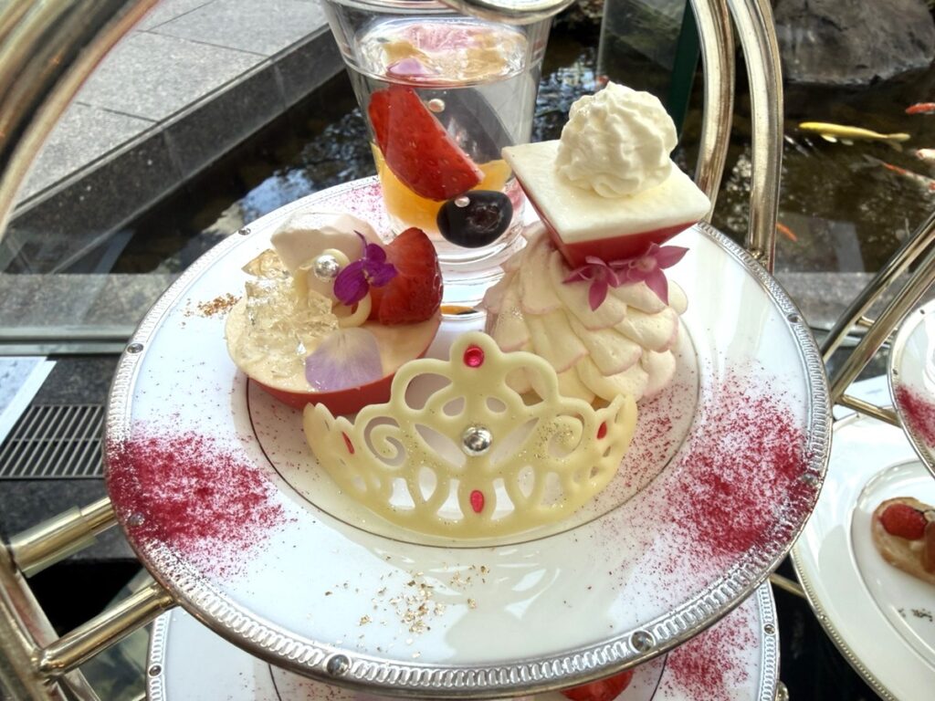 同企画はプリンセスをイメージさせるスイーツが乗った3段スタンドを1人1台のティースタンドで用意してくれる。2人で行くと、1つのスタンドに二人分乗せられてくることが多いが、ここでは一人に一つのティースタンドが用意される。