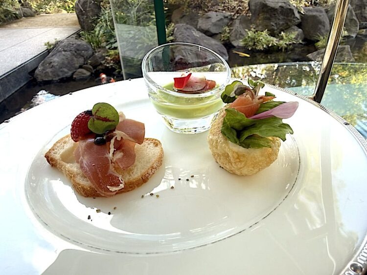 3段目:生ハムといちごのオープンサンド、スモークサーモンとポテトサラダのパニプリ、グリーンピースのムースリーヌとコンソメジュレ