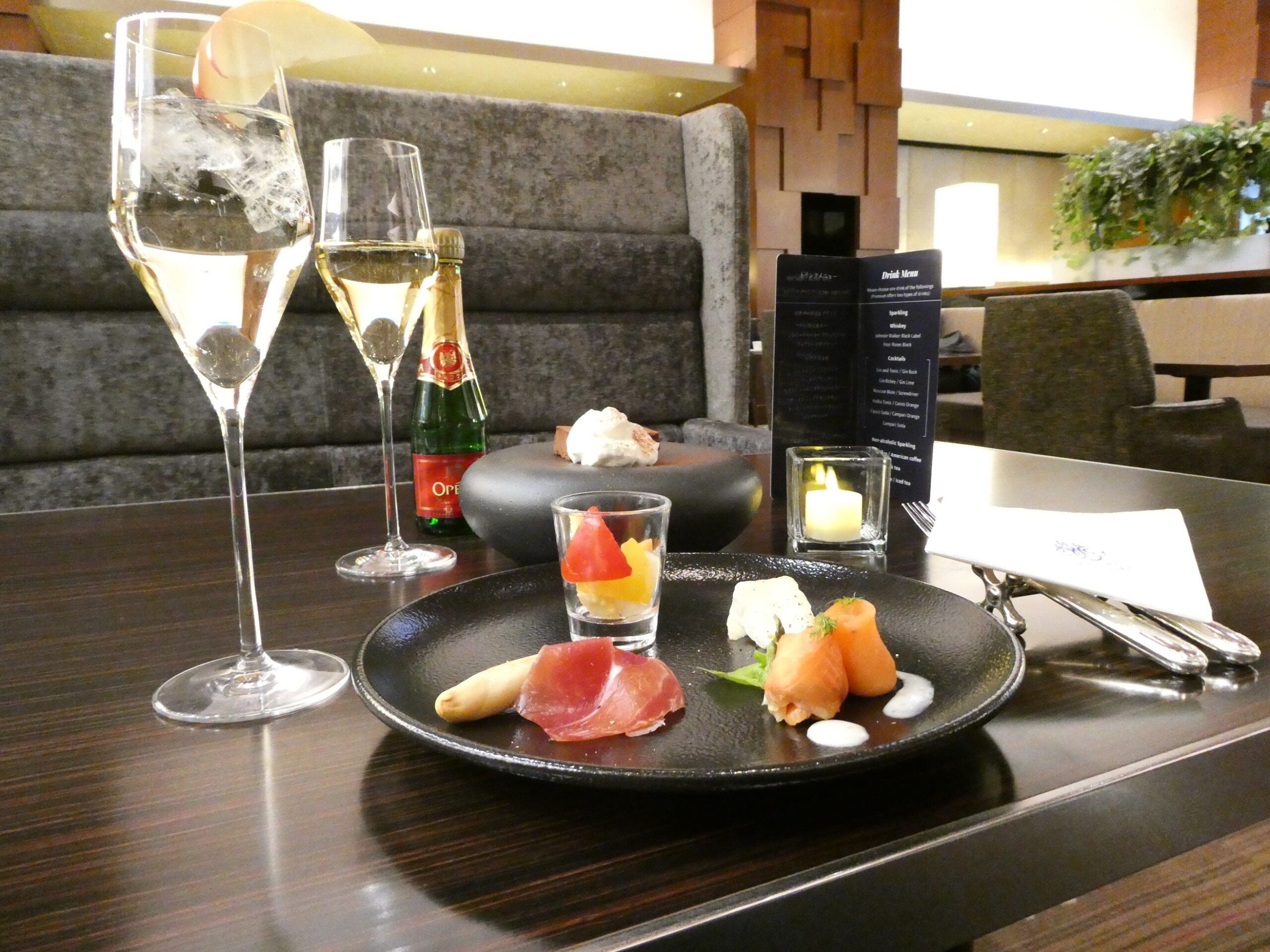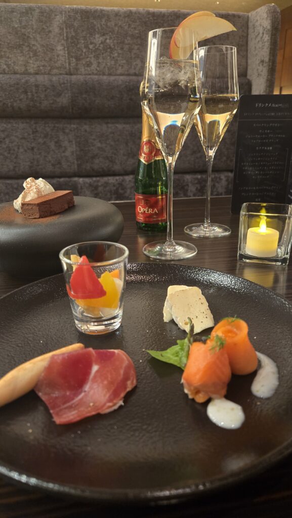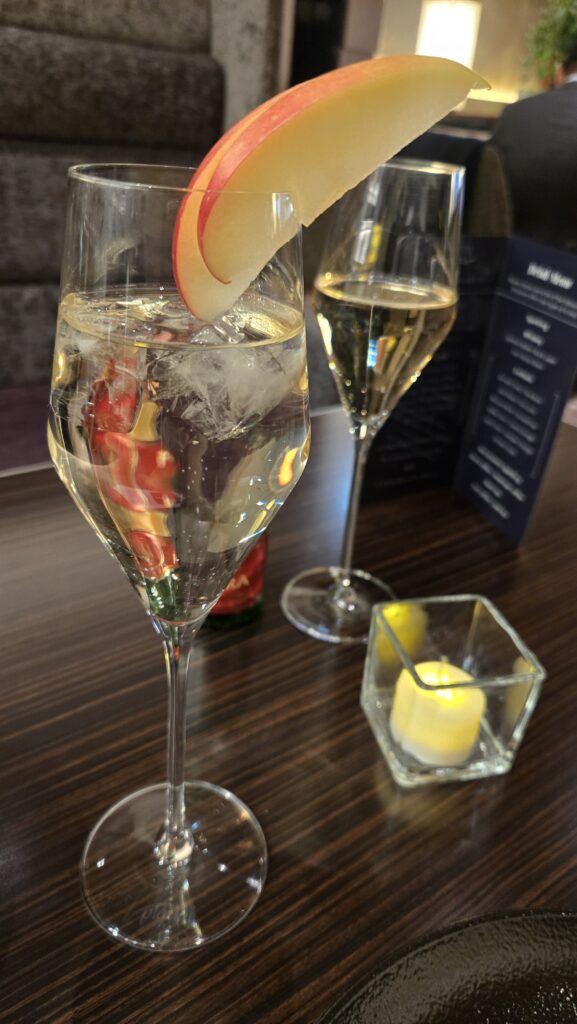 広報によると「りんごのリキュールと炭酸水」で作ったもので、「セットに含まれるショコラケーキに合う」「ウイスキーが苦手な方にも召し上がっていただける」が特長とのこと。グラスにはスライスされたりんごが飾られてあり、ビジュアルも香りもなんとも甘酸っぱい。が、試飲してみると、想像以上に澄んだ味わいで、スイーツの甘味もセイボリーの塩味も引き立てることに驚いた。いや、この一杯が主役であり、スイーツとセイボリーを名脇役に従えている。