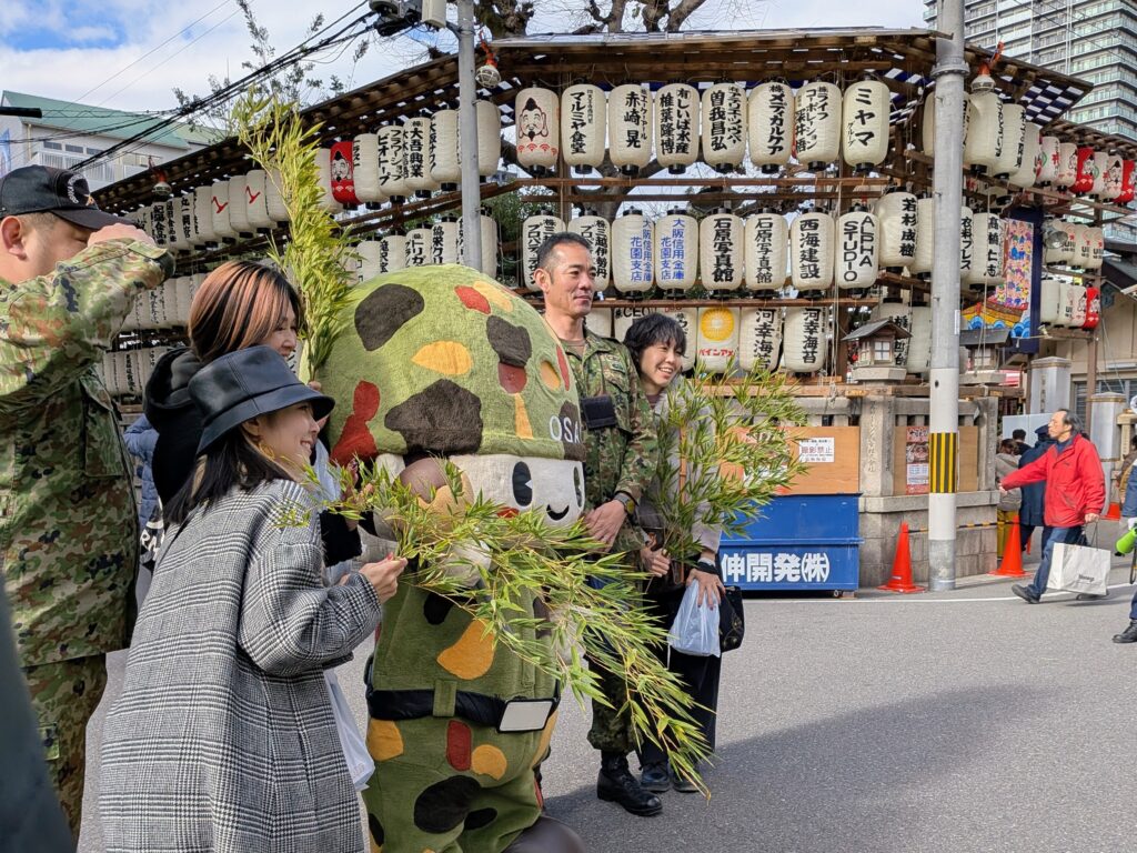 本社が同神社の南側に位置し、自衛官募集などで、同本部を支援している、志グループの布川廣志代表も、まもるくんについて、「10日戎に合わせて、毎年のように来てもらっているが、年を追うごとに、まもるくんの周辺に集まる参拝者が増えている。愛らしい着ぐるみのデザインが素晴らしく、着ぐるみの中に入り、〝熱演〟している隊員スタッフの奮闘も人気の要因となっている。国民の自衛隊活動への理解と隊員募集などの成果につなげてもらいたい」とエールを送っている。