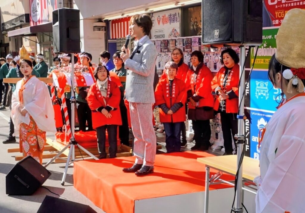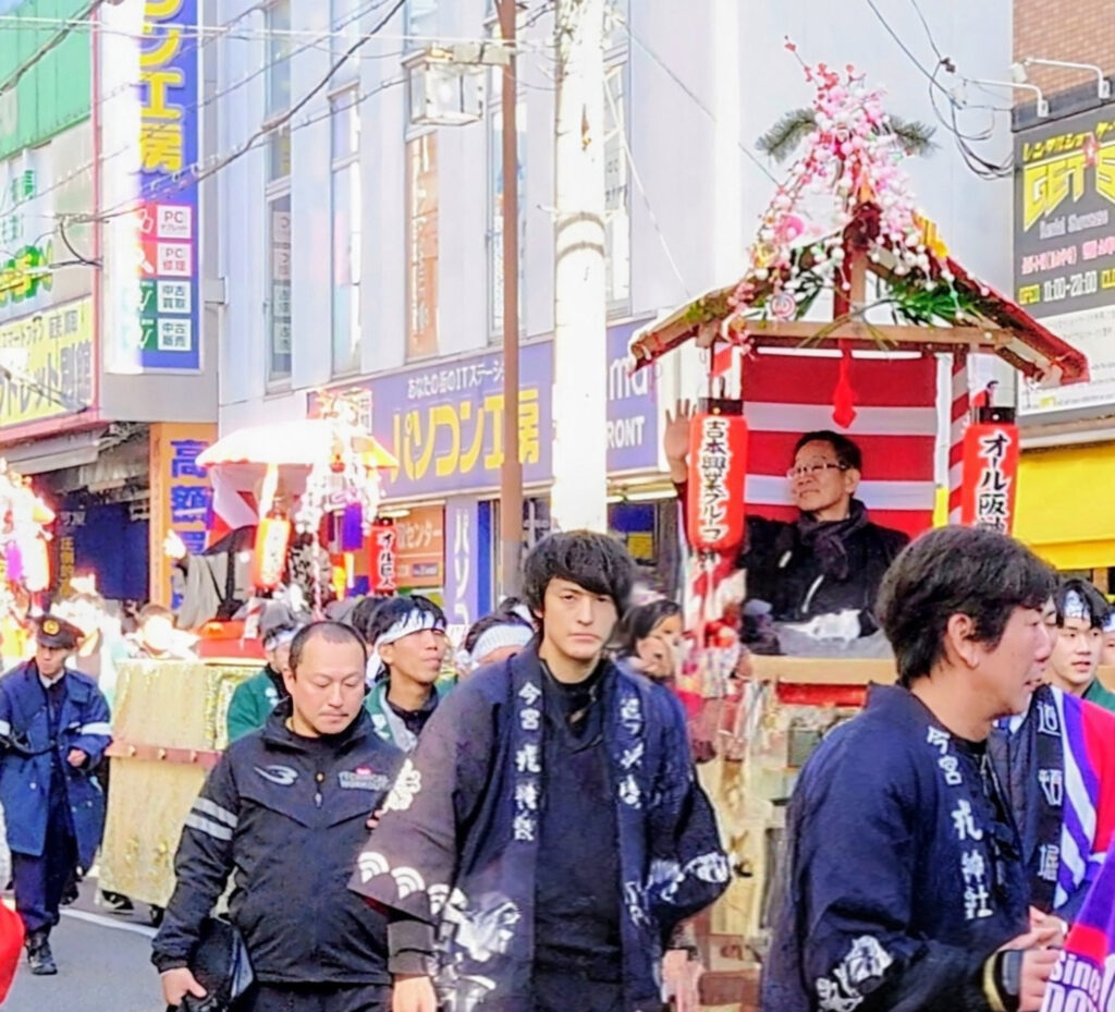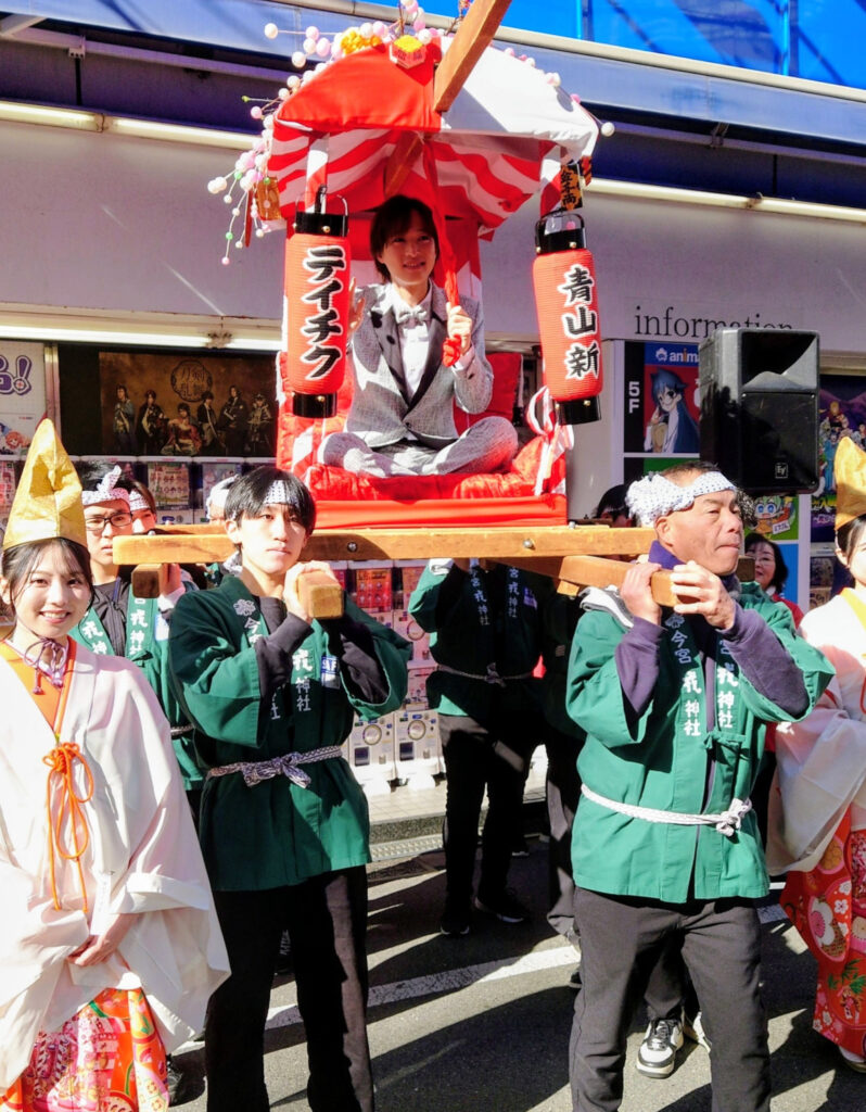 また日本橋の電気屋街では行列到着前に演歌歌手・青山新(25)が集まった女性ファンに自身の持ち歌を屋外で熱唱するサービスぶり。今年デビュー7年目で来月に7枚目のシングルCD「十三ケ月」をカップリングを換えた3パターン同時発売の予定。千葉県出身だが同神社の宝恵かごには3年連続通算4回目の参加。左手で引き手をしっかり握って安定させ右手をひっきりなしに振りながら左右沿道の道行く人々に笑顔を届け「お陰さまで毎年声を掛けて頂いてかなり慣れました。女唄3部作が終わって、次の作品も女唄。今回はカップリングに男っぽい曲も加えたので皆さんの反応が楽しみ」と若さで元気いっぱい。