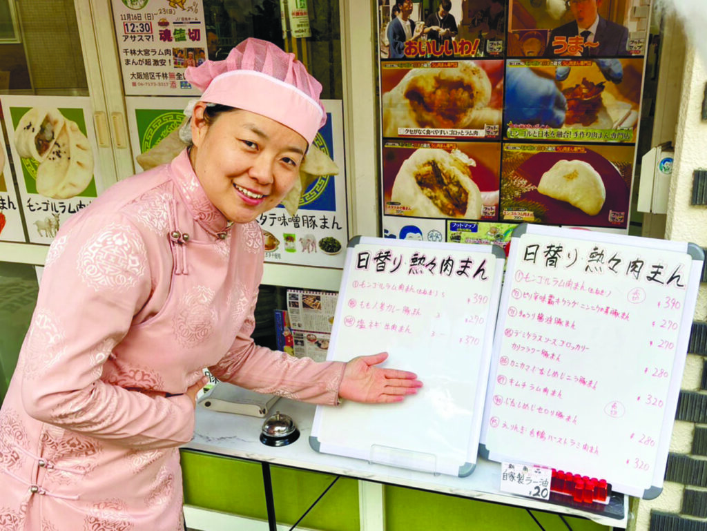 店は千林商店街から「ぷうぷう」の道を曲がってすぐの場所。サーモンピンクの屋根にカラフルな紐飾り、ふわふわの白い雲のような綿毛が揺れる怪しげな外観。ボードに書かれているのは「モンゴルラム肉まん」「しいたけ豚まん」「チャーシュウまん」……へ〜美味しそうだなと思いつつ見ていくと「ホタテ味噌豚まん」「えりんぎ合鴨パストラミ肉まん」「大粒ニンニク塩こしょうオクラえりんぎ牛肉まん」「コーラ人参鶏肉まん」……。何の話?と聞きたくなるが、これ全部〝肉まん〟の品書き。ここは、8年前に来日した井上優奈さんが2024年の元旦にオープンしたモンゴル肉まん専門店なのだ。