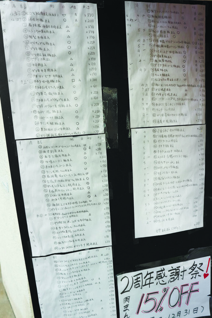 日替わりの10種ほどは出来たてアツアツを販売するが、それ以外は冷凍での持ち帰りや発送のみ。「一度食べた人はまた電話やSNSで注文してくれます。無添加で手作りなので大量生産はできませんが……」とのこと。ニコニコしてとっても優しい井上さん、「雨の日は15%オフとか、ちょっと型崩れは1個サービスとか、毎日何かの割引をしています」。確かに、この店で〝定価〟で買った記憶がない。「まずはこの味を知ってもらうことが大事なので、今は赤字でも仕方ないです」。……ちょっと心配になるが、読者の皆さんが全員購入してくだされば黒字化できると思う。それよりも気掛かりなのは、こうしているうちにもどんどん肉まんの種類が増え、300種に到達しているかもしれないということだが。