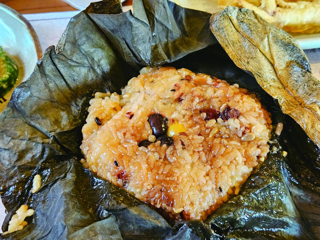 蓮の葉で蒸した名物「蓮の葉ご飯」。香ばしい蓮の葉の香りが特徴で、健康食品としても知られている