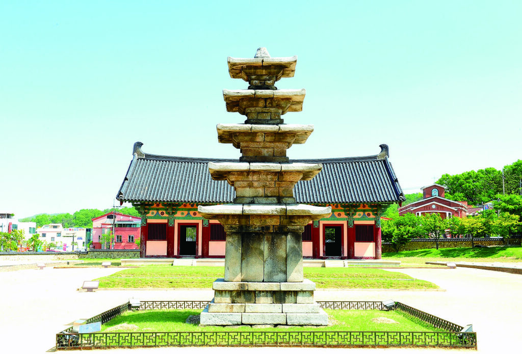 その一つが定林寺址だ。寺院そのものは現存しないが、中門址、金堂址、講堂址が確認され、南北一直線に配置された伽藍構造は当時の仏教寺院の特徴と一致する。中心には五層石塔が残り、百済期の石造建築を伝える遺構として知られる。