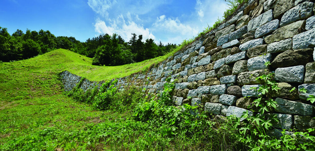 王陵園(旧・陵山里古墳群)もある。扶余中心部から約2㌔に広がる百済王族の墓域で、泗沘期(538〜660年)に整えられたとされる。複数の王陵が並ぶ景観が特徴で、百済の葬送文化が感じられる。近くには防御施設として築かれた扶余羅城の痕跡も残る。扶蘇山城を中心に東西へ伸びる防御線で、築造は538年頃とされる。