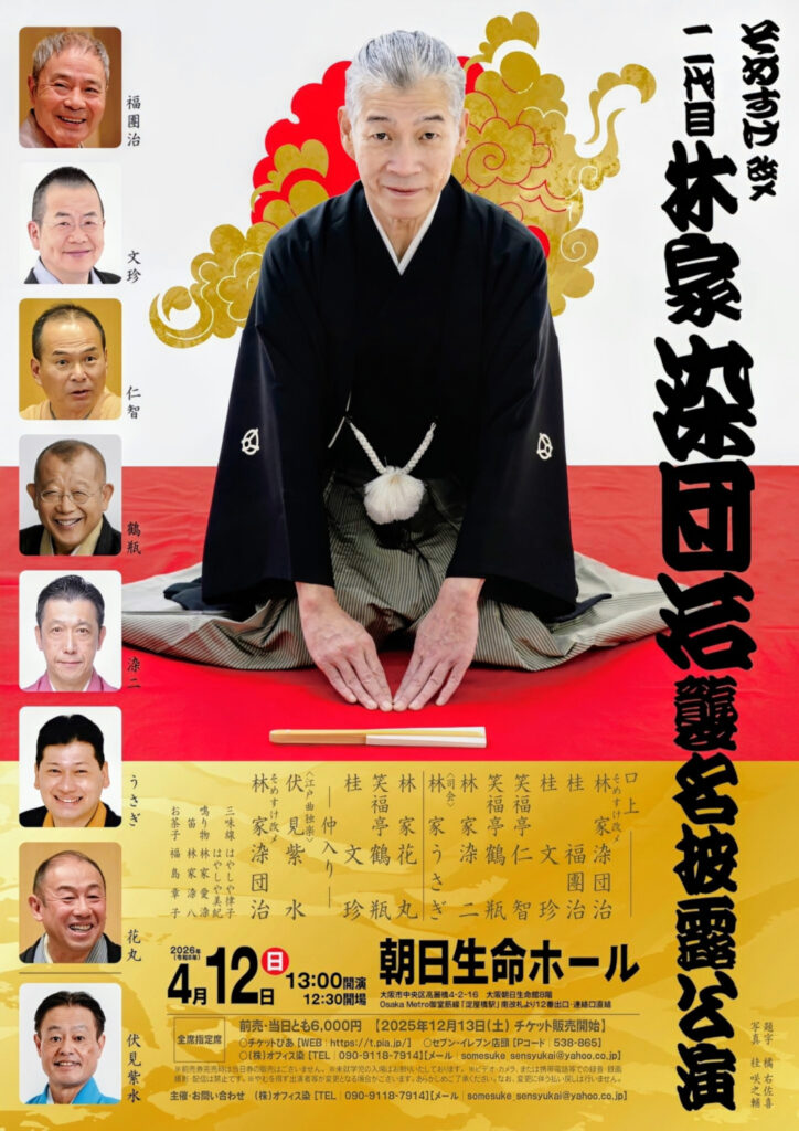 そめすけは漫才コンビ「こあじコースケ」でデビュー。91年に4代目の3番弟子に。モノマネで頭角を現したが、近年は古典や創作の人情落語に力を入れ、大阪市全区をテーマにした「人情落語24区」を完成させるなど地道な高座活動でコツコツと力を蓄えてきた。「自分は市内西成区で生まれ育ち、大阪市の下町にこだわりがある。特に昭和の頃の街の人情を後世に伝えていきたい」と抱負を述べ、襲名公演の演目も24区落語から〝浪速区・通天閣に灯がともる〟を予定。他に上方落語の人気者・笑福亭鶴瓶と桂文珍、江戸曲独楽・伏見紫水が出演する。