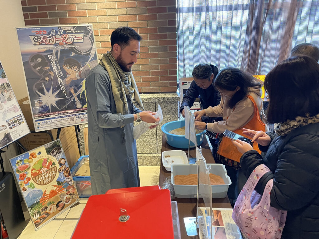 会場となる1階の特設会場では、鳥取県産の旬の果物やご当地スイーツなどを集めた新春マルシェのほか、万博会場で話題を集めた〝砂体験〟を楽しめる。ヨルダン館で展示されていたワディラム砂漠の砂と、鳥取砂丘の砂を並べ、実際に手で触れながら色や質感の違いを確かめられる内容だ。