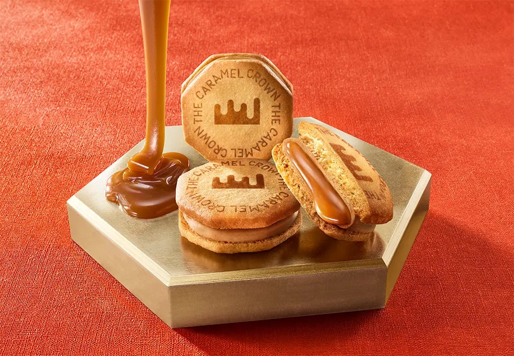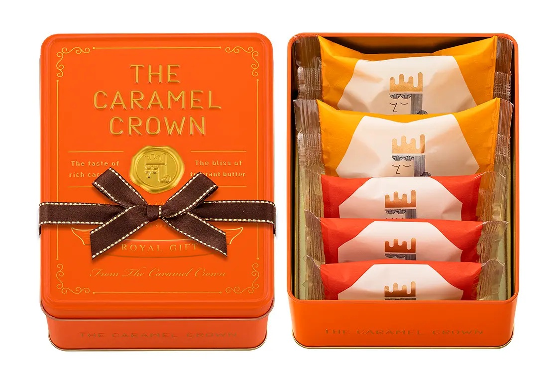 看板商品の「THE バターキャラメルサンド」と「キャラメルケーキ」を詰め合わせたアソート缶で、デザインにも個性が光る。コンセプトは「キャラメル王室からの贈り物」。ブランドカラーである華やかなオレンジ色を基調に封蝋印をイメージしたロゴマークをあしらい、高級感漂うエンボス加工に仕上げた。チョコレート色のリボンもバレンタインギフトらしいアクセントになっている。