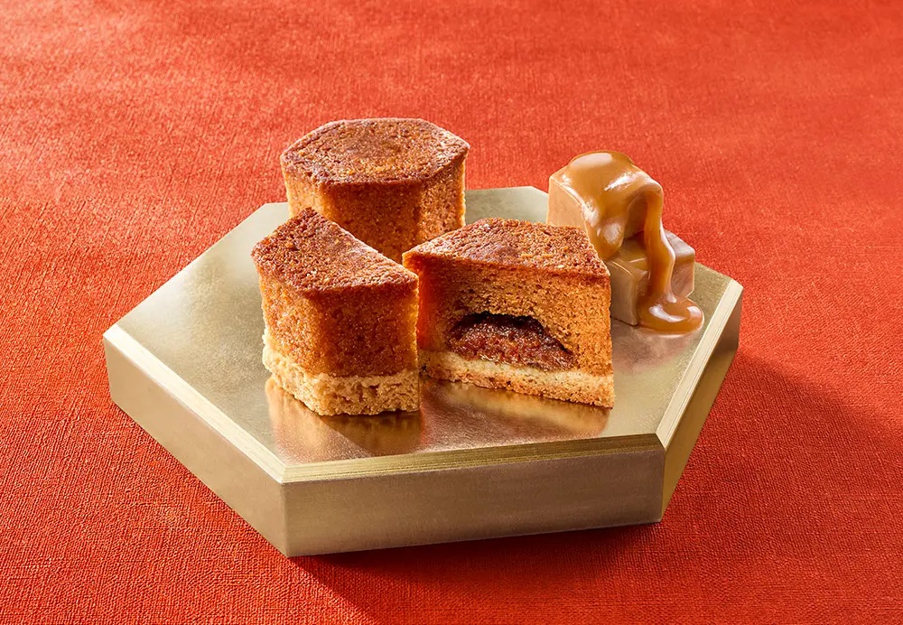 「キャラメルケーキ」は、濃厚なコクのビターキャラメルペーストを、しっとりジューシーなバターキャラメルケーキに包んで王冠型に焼き上げた。ベースにしのばせたタルト生地の口当たりが楽しく、酪農王国ニュージーランド産バターの香りが上品に響き合う。