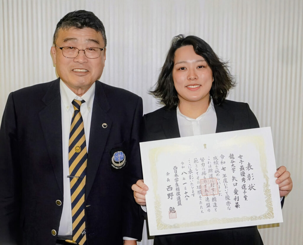 西日本学生相撲連盟は1月18日、大阪市内で令和7年度定時総会を開催。本年度の最優秀団体賞に金沢学院大(山上慈明監督)。最優秀選手賞に金沢学院大・大森康弘3段(22)=4年・金沢学院大高=、女子最優秀選手賞に龍谷大・矢口愛利菜2段(20)=短大部2年・東九州龍谷高=を選出。大森は2年連続2回目、矢口は初。