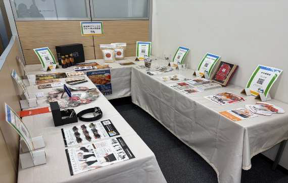会場では、革でありながら伸縮性を持つベルト「超楽FITSTYLE」をはじめ、「鉄みっちゃん~甘南備米~」「富かつⓇ(とんかつ)」「匠クラフト スモークサーモン」「さしみ卵」「竹のインテリア商品」「古布をイメージした和柄のがま口ケース」「万里春麦酒(万里春クラフトビール)」など、富田林ブランド認定商品を展示している。展示商品の販売は行っていない。