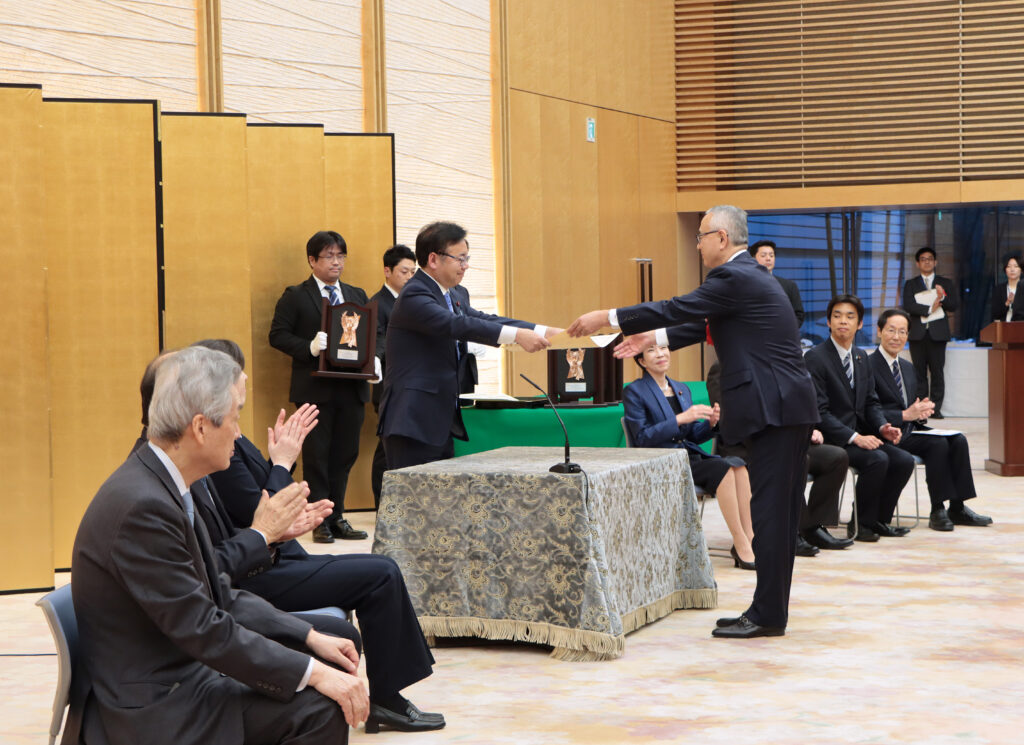 日本医療研究開発大賞の表彰式で、厚生労働大臣から表彰状を受け取る塩野義製薬の会長兼社長CEO手代木功氏=16日、首相官邸(塩野義製薬提供)