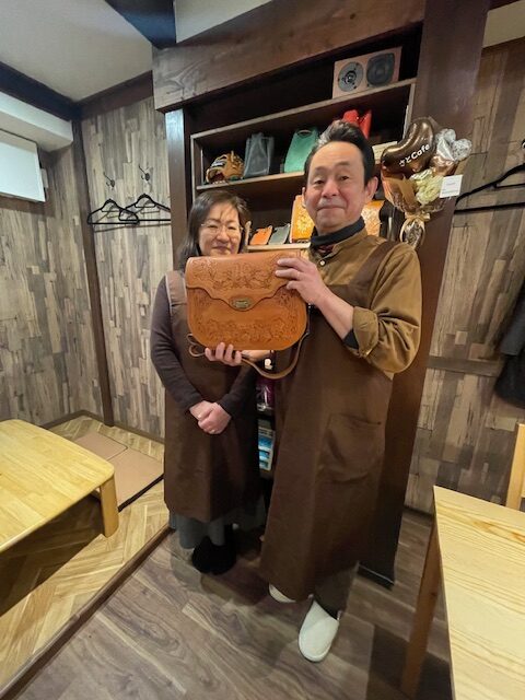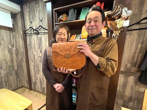 精魂込めて仕上げた皮製品のバッグを手にした松尾さん(写真右)と妻のちはるさん