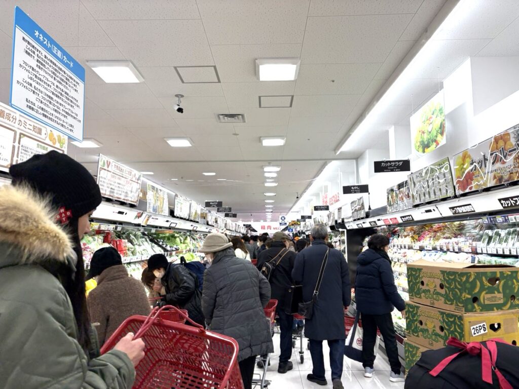 開店当日は朝から多くの買い物客が訪れ、開店前には100人を超える行列ができた。当初は午前9時の開店を予定していたが、混雑を考慮し、予定より20分早い午前8時40分に開店。店内は生鮮食品や日用品などを手に取る来店客でにぎわった。想定来店数に対応できるようレジ台数を確保しており、混雑時でも大きな滞留は生じなかったという。