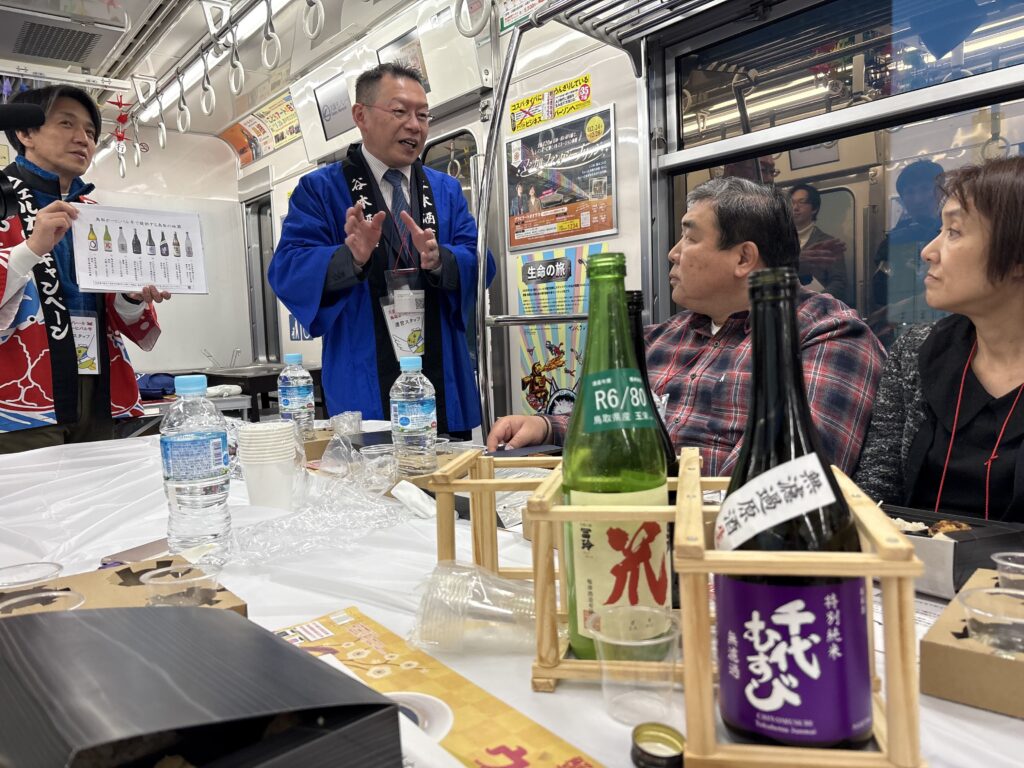 運行中は同県出身者によるトークライブも開催。覆面パフォーマー「マスクドサチ」さんが登場し、さらに「鳥取の酒の伝道師」こと谷本酒店・谷本暢正社長による地酒トークライブも開催。先日の鳥取地方の地震で被害を受けた「千代むすび酒造」で、被災を免れて残った貴重な酒も今回提供されていることが紹介され、参加者はその説明に耳を傾けていた。