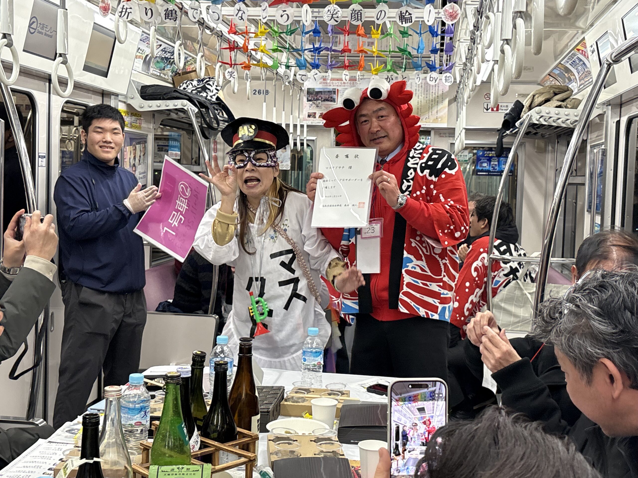 車内イベントでは、じゃんけん大会や抽選も実施され、優勝者には鳥取産のカニが当たるなど盛り上がりを見せた。また、万博記念公園駅構内でも「とっとり地酒☆ときめきマルシェ」が同時開催され、御燗酒BARや観光PRブース、特産品販売に熱気があふれたほか、寒い季節にうれしい熱々のカニ汁も振る舞われた。