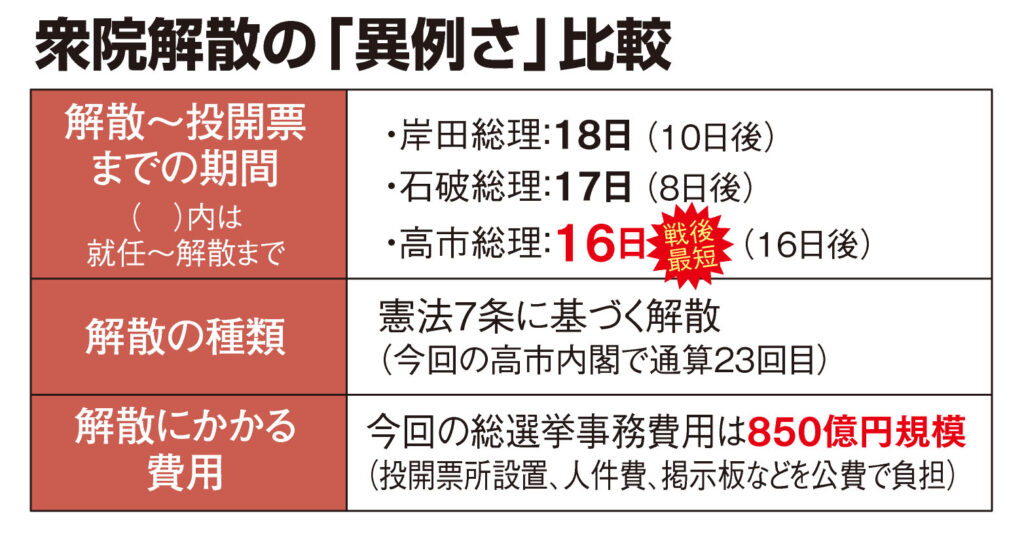 解散から投票までは「40日以内」としか決まっていない。岸田17日、石破18日に続き、高市16日は戦後最短とされる。総選挙の事務費用は物価高もあり850億円規模。投開票所の設置、人件費、掲示板、選挙運動はがきなどが公費で賄われる。定数削減で年間数十億円削れるとしても、「解散せず任期いっぱい務めればいい」という疑問が消えないのは当然だ。