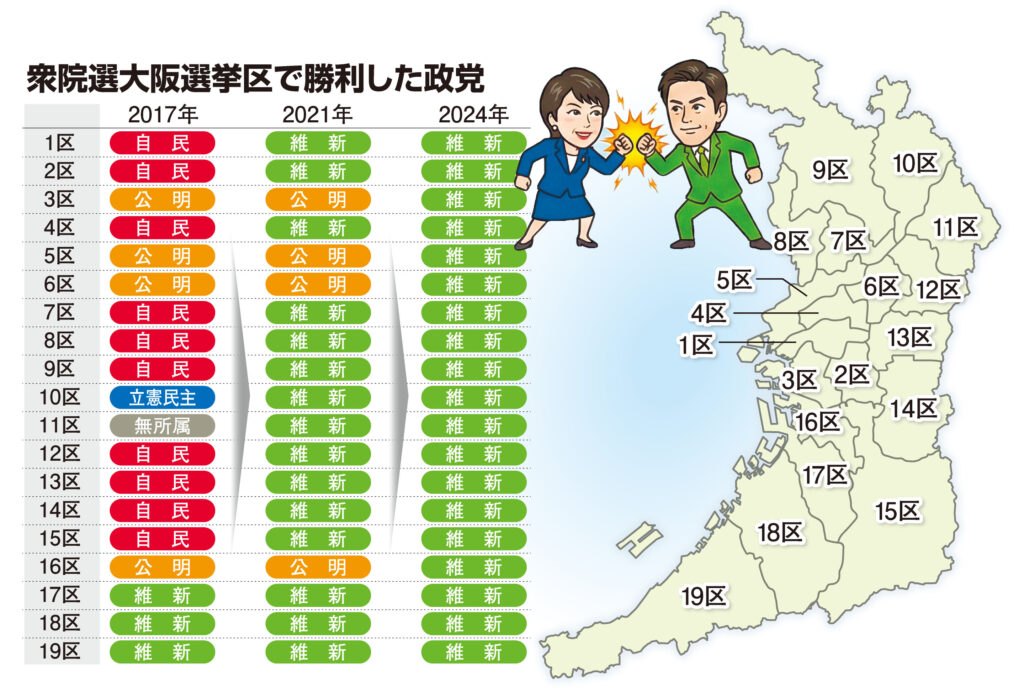 大阪は東京に次ぐ19選挙区。小選挙区制が始まった1996年以降も、16対3、17対2、18対1といった 〝振れ幅の大きい結果〟を繰り返してきた。維新が本格参戦した2012年以降は勢力図が塗り替わり、21年は維新が伸びて自民がゼロ、24年は維新が19区全勝。勝ち負けが一気に傾く土地柄だ。