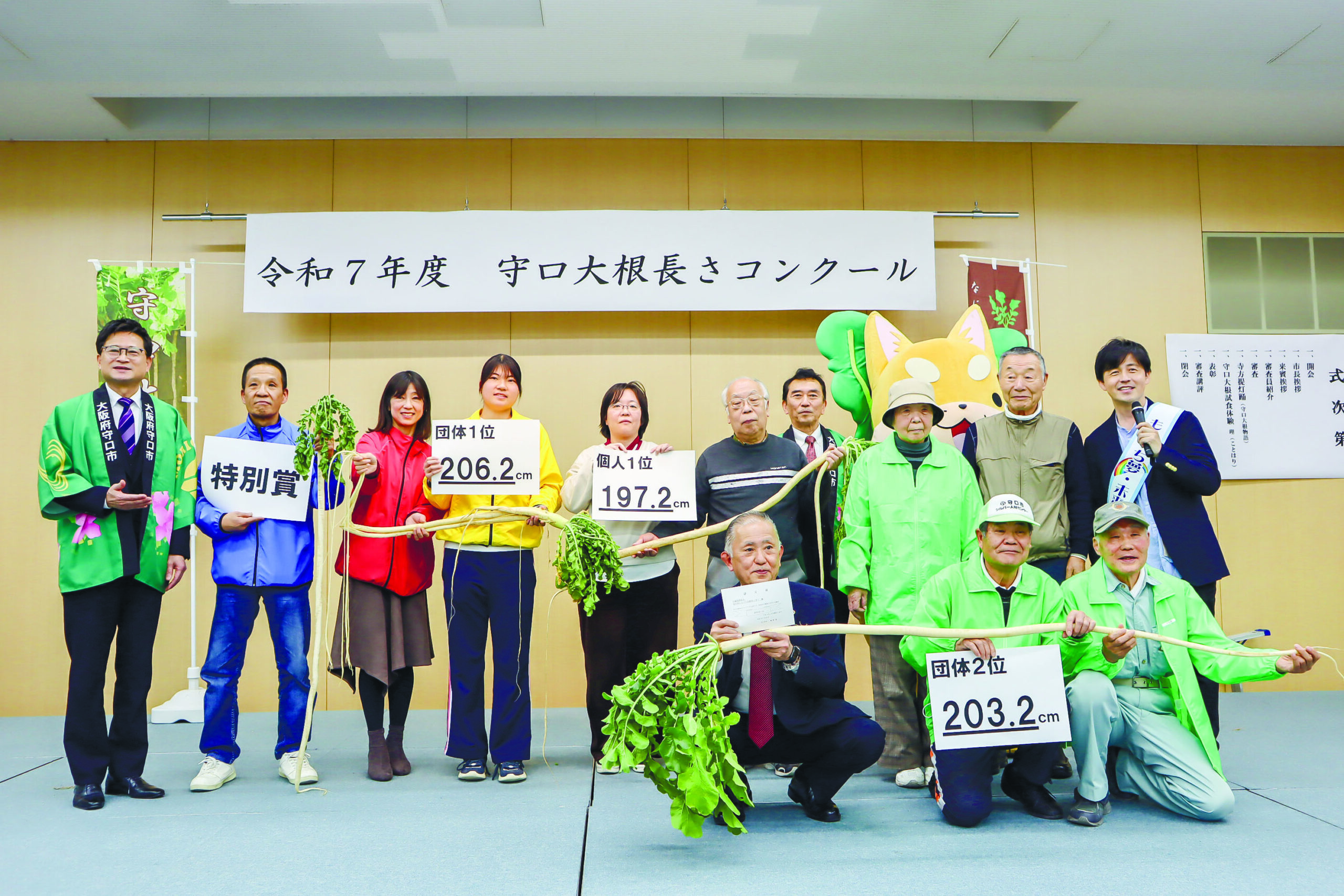 このほか、守口市シルバー人材センターが惜しくも3㌢差の203・2㌢で、2位の優秀賞となった。個人の部1位の最優秀賞は197.2㌢の楠本史絵さんが獲得した。また、葉の奇麗な守口大根らしさが評価され、寺方幼稚園が特別賞に選ばれた。