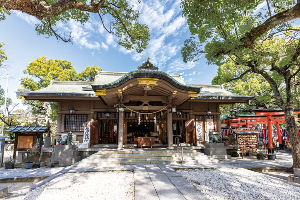 仁徳天皇をまつる由緒ある神社。境内ではマルシェなどの催しも。併設カフェ「富亭」は地域交流の場として親しまれている。