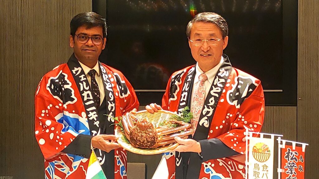 試食の席では、平井知事に同行していた鳥取県議会議員で鳥取県・インド友好議員連盟会長の島谷龍司氏が、「松葉がには生ならその日のうちに、ゆでても数日中に食べるのがベスト」と紹介。これを聞いたアッパル総領事は驚いた表情を見せた。約1万1000㌔に及ぶ海岸線を持つインドでも、こうした鮮度を重んじる食べ方は意外だったようで、日本の食文化の高さを印象づける一幕となった。