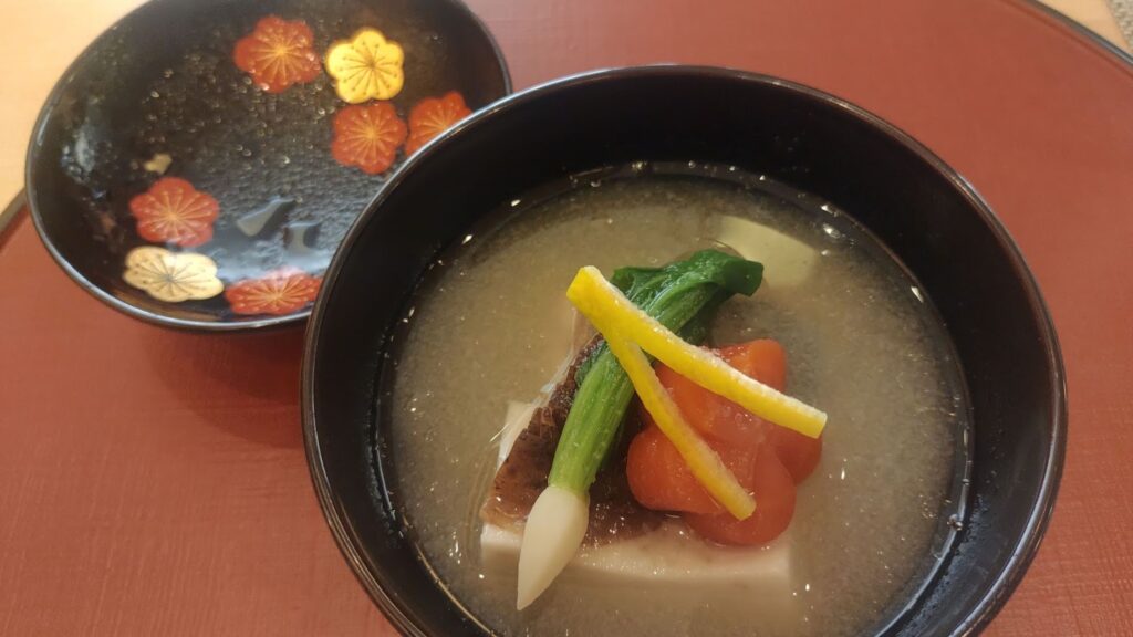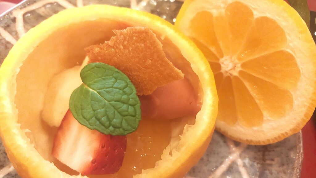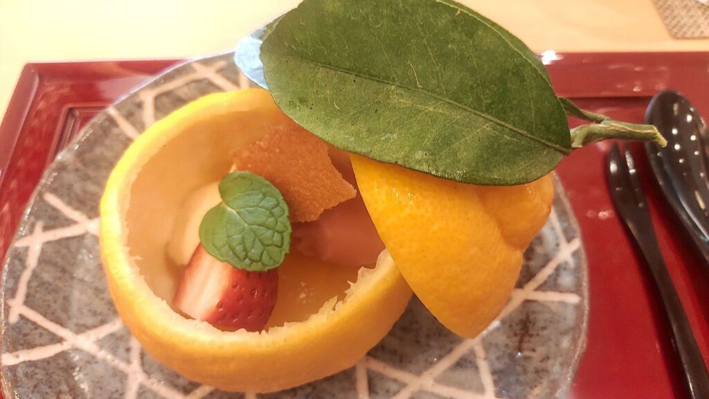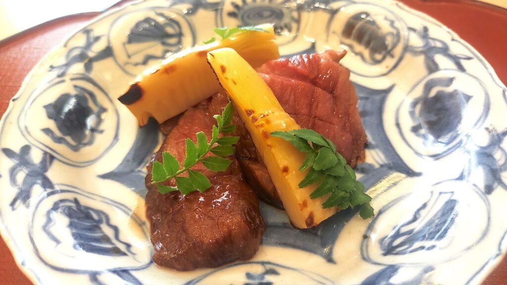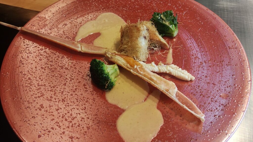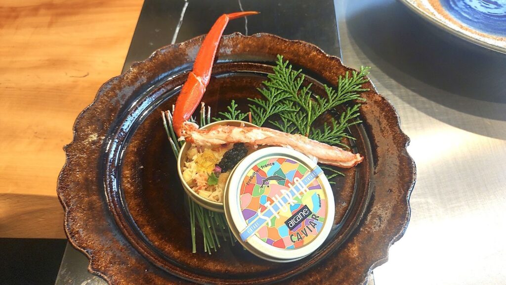 懐石コースでは、松葉がにを使った3種の料理をはじめ、鳥取和牛の中でも脂肪中のオレイン酸含有量が55㌫以上という厳格な基準を満たしたブランド牛「鳥取和牛オレイン55」、鳥取県の新品種イチゴ「とっておき」を丸ごと使った甘味などが並ぶ。いずれも素材の力強さと繊細な調理が際立ち、〝一味違う〟鳥取の底力を感じさせる内容となっている。