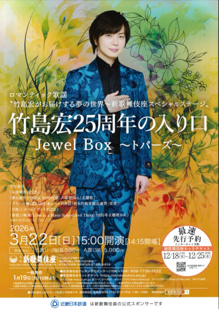 演歌、ムード歌謡の歌手として女性に絶大な人気を誇り今年デビュー25周年を迎える竹島宏(47)が、昨年に続き今年も3月22日に大阪・新歌舞伎座で単独コンサートを開く。