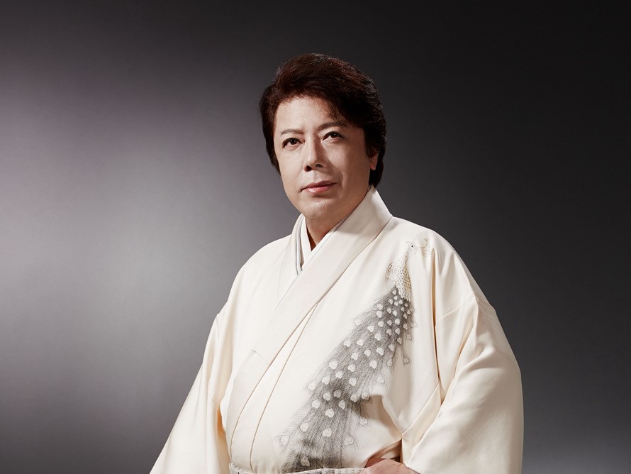 白地に墨痕のすっきりしたイメージの秋岡の舞台衣装