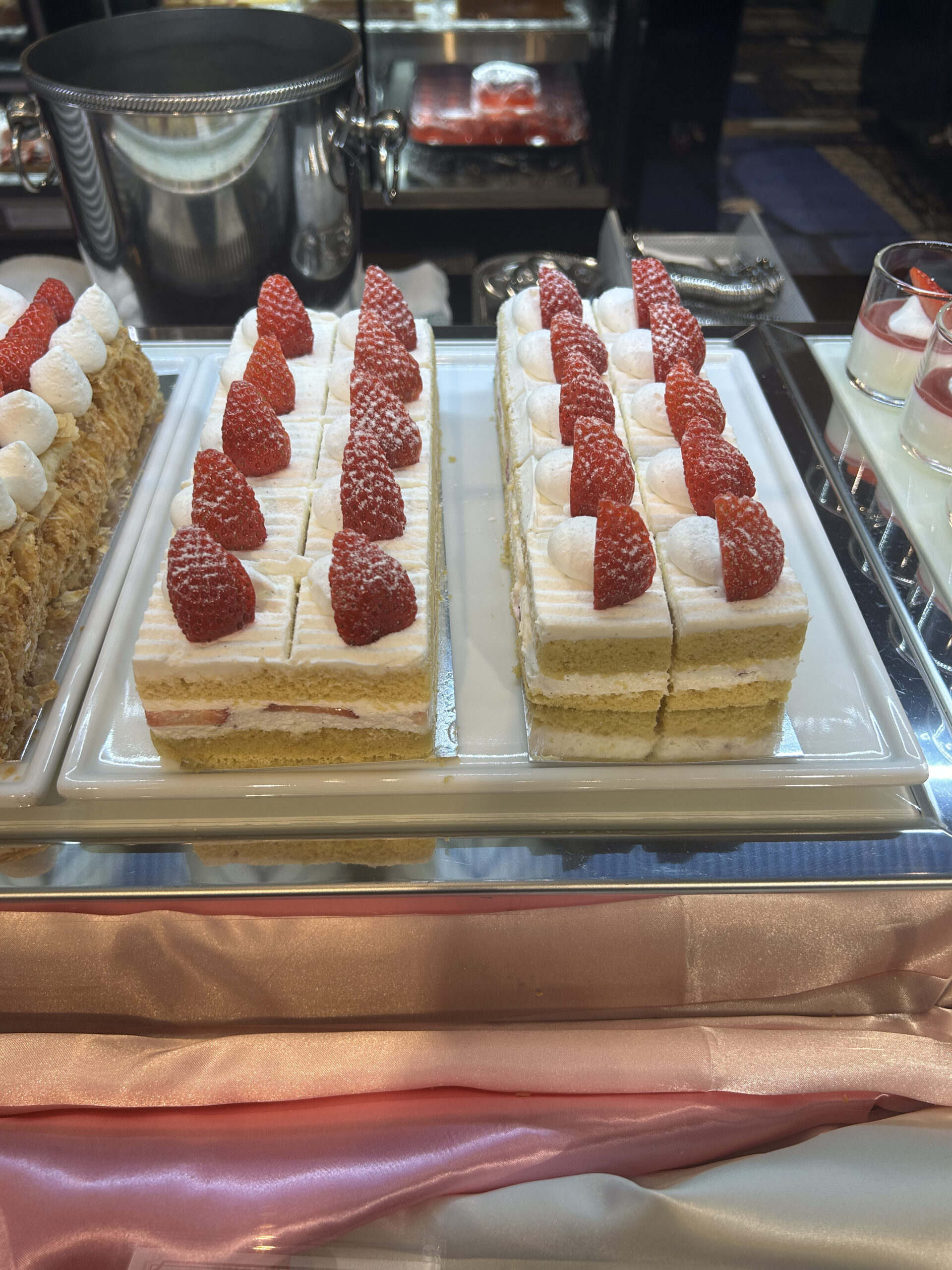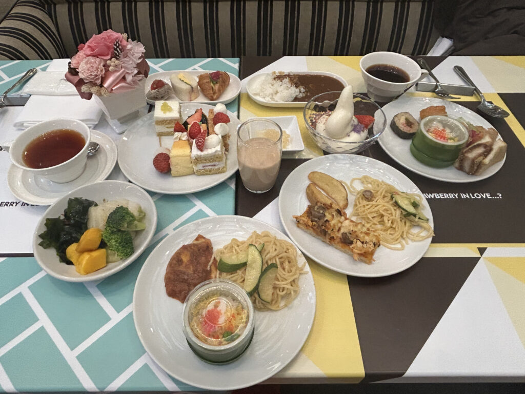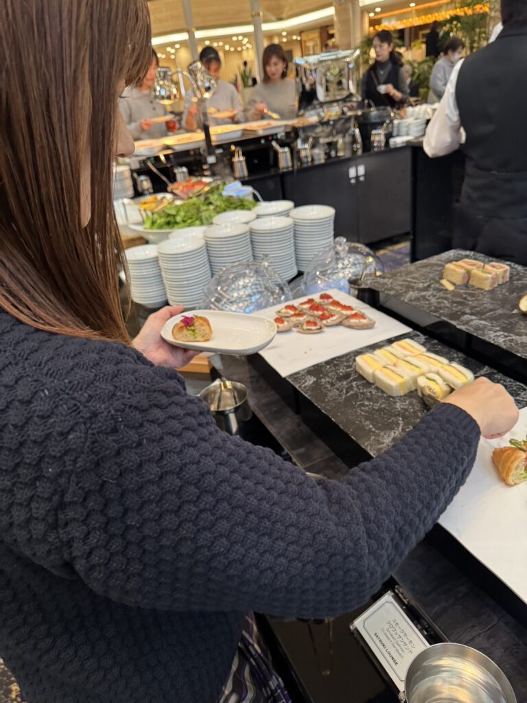 同ホテルの代名詞ともいえるスーパーシリーズの「新スーパーあまおうショートケーキ」「スーパーメロンショートケーキ」や「ニューオータニ特製パンケーキ」などがビュッフェサイズで食べられる。特にケーキのスポンジの層は通常の1・3㌢から1㌢へ薄めにスライスされている。広報担当の松山貴美子さんは「ビュッフェではいろいろな種類を楽しんでもらいたいので、あえてこのサイズにしている」と話す。全種類を制覇したい、という顧客心理に寄り添った工夫が感じられる。