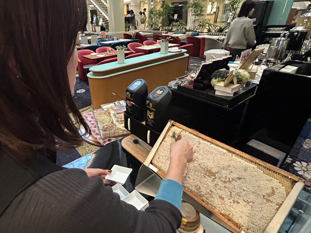自らナイフで削り取った蜂蜜は、ソフトクリームやパンケーキなどに自由にトッピング可能。自分の手で仕上げるひと手間が、食の楽しみをさらに広げる。