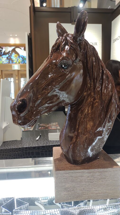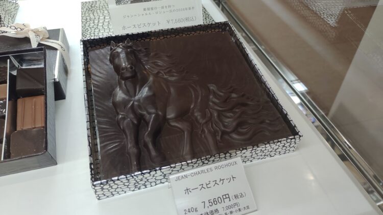 来日したショコラティエのジャン=シャルル・ロシューさんは、「日本では今年が午年なので、この馬のチョコレートを作ってきた」といい、ショコラティエの技術と彫刻家としての腕を奮って作り上げたチョコレートだけでできた馬の頭部を展示。