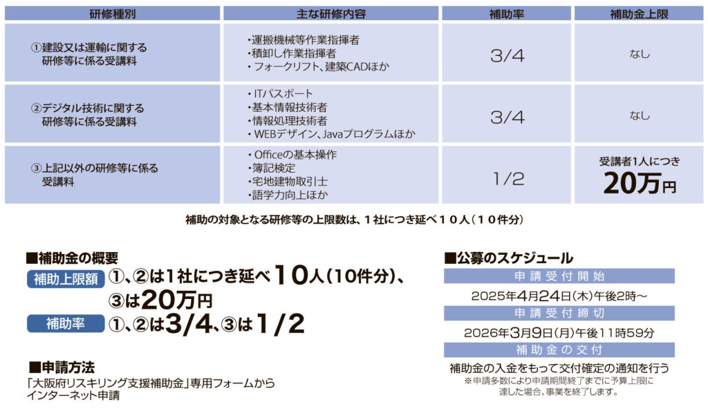 対象となるのは、大阪府内に本店または事業所を有する中小企業等で、社外の研修実施機関が提供する研修を従業員に受講させる事業者です。研修種別は、①建設・運輸分野、②デジタル技術分野、③そのほかに簿記やCAD、語学など、業務に直結する実践的な研修が想定されています。