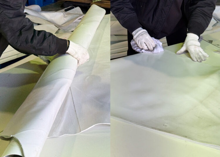 特に製品の品質を左右する裁断工程については、高い技術力を持つ大阪の縫製工場「ふく江」が作業を担当している。強靭な膜素材ならではの加工難度に対し、職人が手作業で細かな調整を重ねながら、一点一点丁寧にパーツを切り出している。