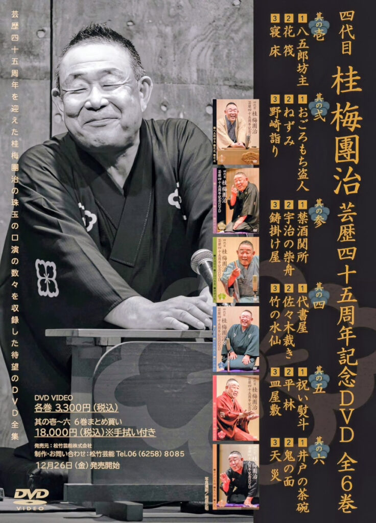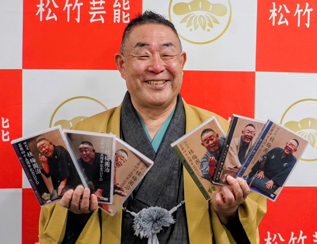 DVDは1巻3000円、既に発売中の6巻まとめ買いは1万8000円で梅團治手ぬぐい付き。問い合わせは所属の松竹芸能(06・6258・8085)まで。