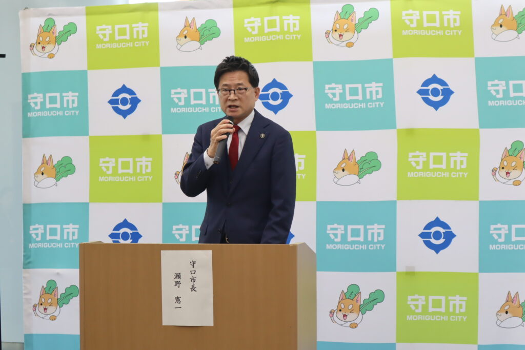 守口市の2026年度当初予算案を説明する瀬野憲一市長=市役所で