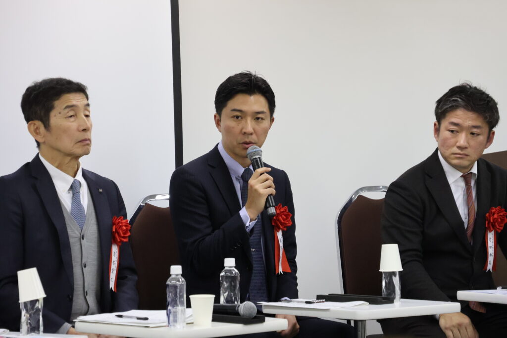 第1部では講演とオープンディスカッションを実施。100億円を達成した企業として、奥野製薬工業(大阪市鶴見区)の奥野直希社長、日伸工業(滋賀県大津市)の清水貴之社長が登壇し、達成までの歩みや自社の強みなどについて語った。