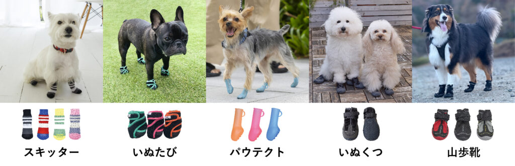 当日試せるのは5シリーズ。室内向けの滑り止め付き靴下「スキッター」、履き口が大きく開く定番モデル「いぬたび」、保湿成分スクワランオイル配合でフィット感を高めた「パウテクト」、アウトドア向けのゴム底靴「いぬくつ」、高耐久仕様で「万博警備犬にも採用された」という「山歩靴」などを用意する。