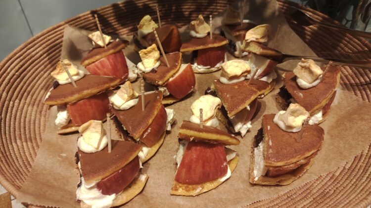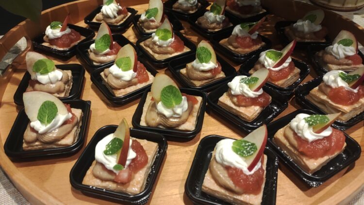 この日から始まった同フェアにはグランフロント大阪の14店舗が参加。試食で提供されたスイーツのほか、「青森県産りんごと紅茶のはちみつカステラ」や「りんごの生春巻」「ポルケッタ りんごソース」「春菊と燻製生ハムと青森りんごのゴルゴンゾーラ」「りんご×オイルサーディンのパスタ」など、意外な組み合わせで新たな魅力を引き出した多彩なメニューを用意する。