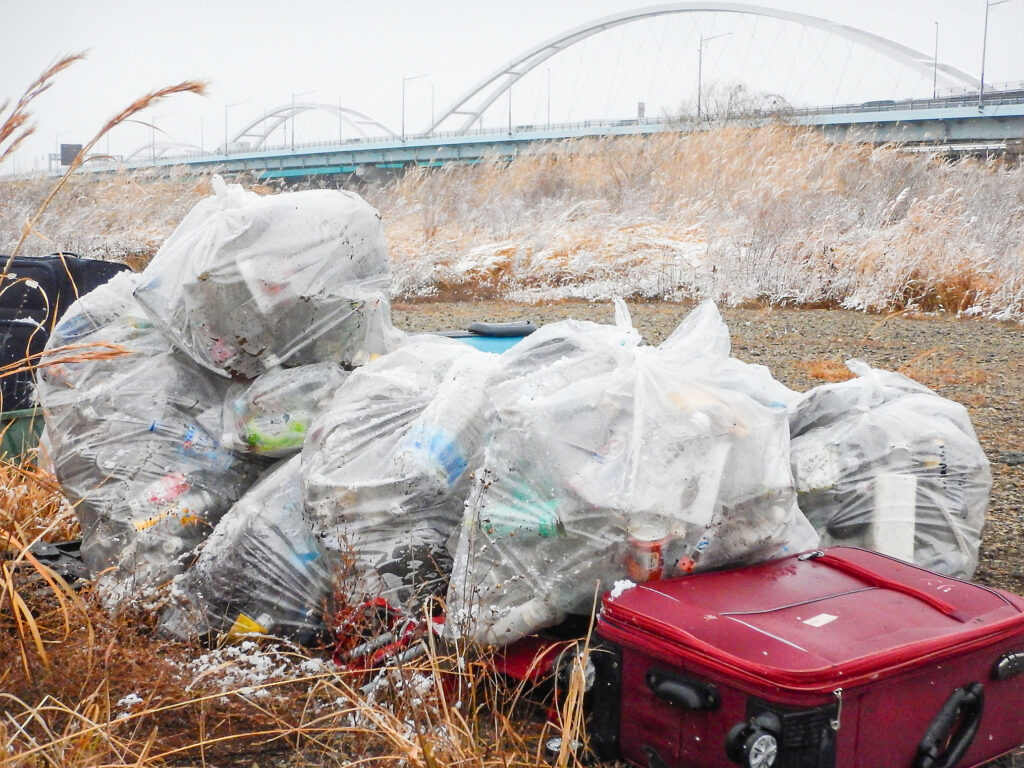 当日は一時、吹雪となる荒天に見舞われたため、作業時間は約30分に短縮し、活動範囲も限定された。それでも飲料用ペットボトルやアルコール類の空き缶、カップ麺の容器などが多数集まり、70㍑入りのごみ袋約20袋分に上った。草むらからは、バーベキューで使用されたとみられる金網やスーツケースなども見つかった。集められたごみは、国土交通省淀川河川事務所が処分する。