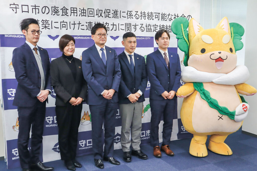使用済み食用油のリサイクルに関する協定を締結した瀬野憲一市長(中央)と関係者ら=守口市役所(小泉健一撮影)